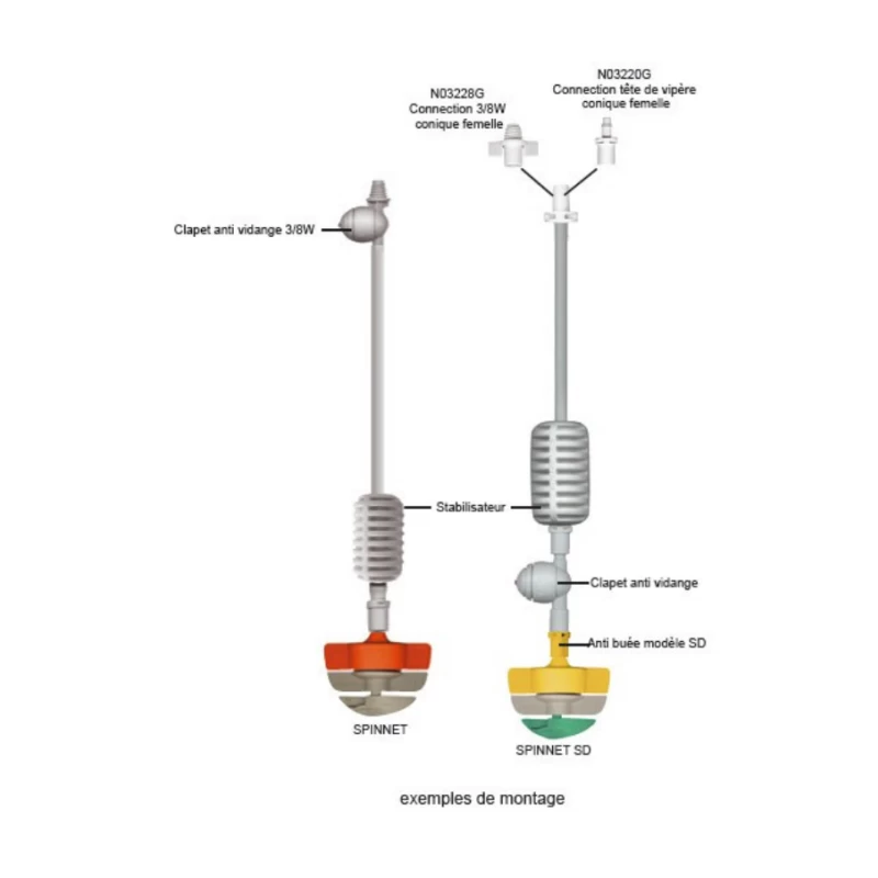 Attention : Cet asperseur est vendu seul. Les accessoires de montage (tubing, jonction conique, clapets anti-vidange) sont à commander séparément. Filtre à 130 μ minimum requis en amont.