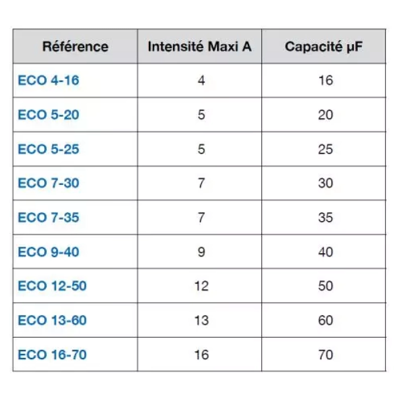 | Référence | Intensité max | Capacité condensateur |