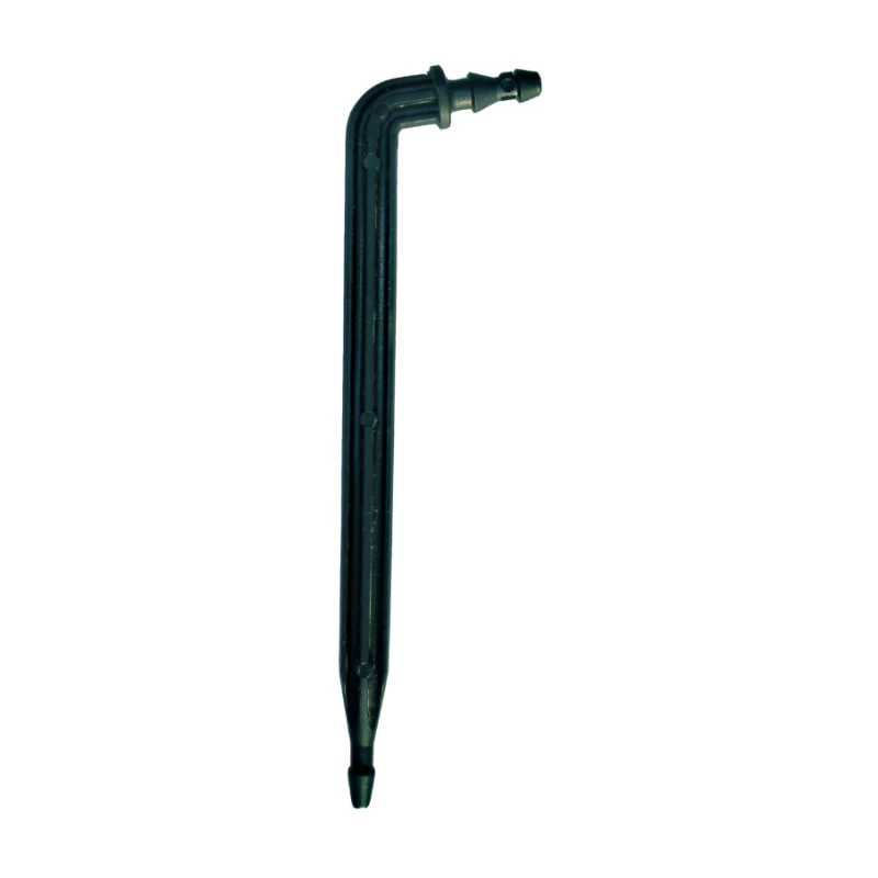 Enfoncez simplement le piquet dans le sol ou dans le substrat de vos pots, puis connectez votre tube de 3 ou 4 mm au connecteur prévu. Vous pouvez ensuite y ajouter le goutteur de votre choix pour affiner le débit selon vos besoins. Idéal pour construire un réseau de goutte à goutte sur mesure, notamment avec des goutteurs auto-régulants comme les modèles AccuFlow (NDS) ou XB-PC (Rain Bird).