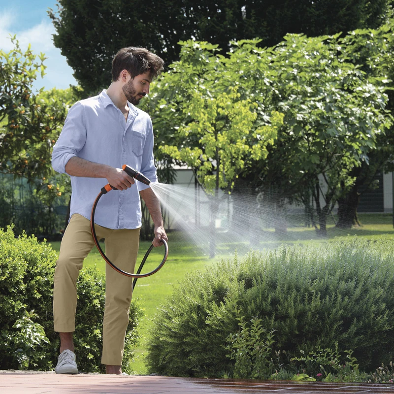 Ce pistolet excelle dans tous les contextes d’arrosage grâce à sa grande polyvalence. Activez l’ouverture/fermeture en pressant simplement le bouton avant avec un doigt, puis ajustez le débit et la nature du jet avec la manette arrière. Passez sans effort d’un jet puissant et concentré pour cibler précisément vos plantes, à un brouillard fin et homogène pour les semis fragiles ou les feuillages délicats. Le système Quick-Click assure un emboîtement rapide sur votre tuyau, tandis que la protection antichoc préserve le pistolet des chocs accidentels.