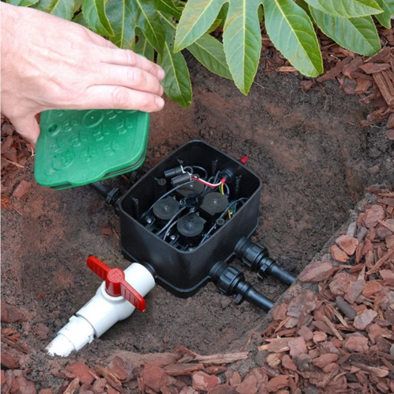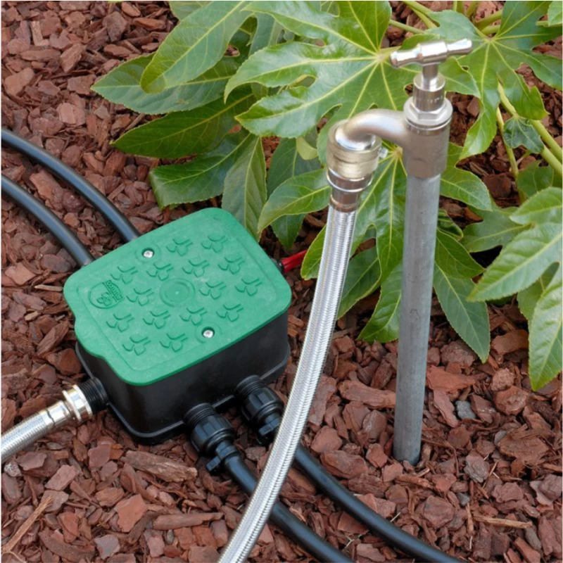 Ce système préassemblé révolutionne l’installation des circuits d’irrigation enterrés. Grâce à ses 4 électrovannes déjà montées dans le regard étanche, vous gagnez un temps précieux lors de la mise en place. Il suffit de brancher les câbles électriques à votre programmateur compatible (24V ou 9V) et de raccorder vos tuyaux d’irrigation aux sorties 3/4″. L’entrée accepte un nez de robinet ou un raccord standard, ce qui facilite les configurations adaptées à votre jardin, potager, pépinière ou serre. Le filtre intégré protège votre réseau d’irrigation contre les impuretés, tandis que le boîtier IP65 hermétique préserve les électrovannes de la poussière, de l’humidité et des nuisibles. Les matériaux ultra-résistants aux UV garantissent une durabilité exceptionnelle en extérieur.